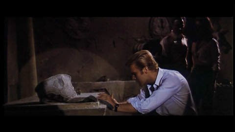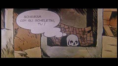 Il d'abord intéressant de noter que si le souffle de la "psysploitation" balayait Kriminal, ce second opus offre plus volontiers son torse au cinéma d'aventure exotique. Sous la caméra de Cerchio, le personnage titre n'évolue guère, du moins à première vue. Car il s'agit à nouveau d'un trompe l’œil. Glenn Saxson y porte le costume et le masque avec plus d'assiduité, chacune de ses apparitions est même désormais accompagnée d'un frottement de Guiro, sans doute censé évoquer le claquement des os et appuyer la dimension fantastico horrifique de l’accoutrement.
