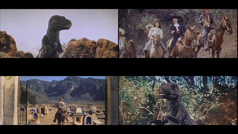 Non content d'être le seul film en couleur du coffret, The Beast of Hollow Moutain est aussi un western. Dinosaures et cowboys, un télescopage thématique à première vue impossible qui imprimera la pellicule en 1956. Connue pour avoir été la première bobine à combiner la stop motion, le cinémascope et la couleur, cette coproduction americano-mexicaine se désintéresse dans un premier temps de son théropode gourmand au profit d'une intrigue plus classique. Jimmy, fraichement installé dans les collines mexicaines ne dirait pas non à la locale de l'étape, la jeune Sarita. Mais la belle se trouve malheureusement promise à Rodriguez. Et ce dernier n'entend ni partager sa future femme, ni les terres de son pays avec ce texan décidément très envahissant. Après 40 bonnes minutes, notre reptile géant se rappelle tout de même à notre bon souvenir, sous la forme d'une ombre, puis de prothèses. (Tu as vu mes bottes dino comme elles sont belles ?) Et Pour finir par une animation certes perfectible mais charmante. Point d'orgue de cette aventurette délicieusement datée: Notre cow boy contraint de jouer les tarzan sous les yeux médusés de la créature, espérant ainsi la faire tomber dans des sables mouvants. Un dinosaure, aussi Bis soit-il, est-il assez con pour se laisser berner par un tel subterfuge ? Pour le savoir, il vous faudra voir «The Beast of Hollow Moutain» ! Si là on ne vous l'a pas vendu ...On ne vous le vendra jamais... Rayon copie, il ne faudra pas attendre de miracle. Encore une fois, Artus a du faire avec les matériaux existants et tout effort de restauration est à mettre en rapport avec les réalités économiques de l'édition d'un tel métrage. Reste que le disque délivre tout de même cette «bête de la montagne de l'ombre» dans son format d'origine 2.35.