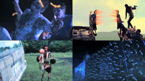 Excroissance de la firme Nikkatsu, le label Sushi Typhoon entend surfer la vague et l'engouement transfrontalier suscité par Tokyo Gore Police, Machine Girl & co. Et c'est l'un de ces premiers rejetons pelliculés, Helldriver, dont il nous est permis de disserter aujourd'hui. Première constatation, tout ce qui fait la substance des œuvres précitées se retrouve dans ce nouvel effort : Frénésie conceptuelle, folie visuelle et pitch improbable. Au programme, une jeune lycéenne nommée Kika qui découvre en rentrant chez elle que sa mère et son oncle sont en train de béqueter son père tétraplégique. (La journée commençait déjà mal !). Le temps de se retourner, un étrange corps céleste en flamme traverse le ciel pour perforer le torse de cette maman cannibale dont la réaction laisse penser que l'instinct de survie est définitivement plus fort que l'instinct maternel. Elle arrache le cœur de sa pauvre fille pour se l'implanter sur le champs et se métamorphose (soyons fous !) en étrange monticule de résine, recrachant dans l'air un nuage de cendre. Nuage qui transformera une bonne partie de la population japonaise en créatures affamées et dotées d'une tumeur cérébrale apparente. (Un demi bretzel planté dans le front).